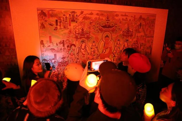 这次画展酒店特别建立了一个模拟敦煌石窟空间,模拟古人进窟观壁画的昏暗情景,还原敦煌石窟观看体验。立身于此仿若回到千年之前,也让观众在进入展区的刹那便沉浸于敦煌的艺术殿堂。