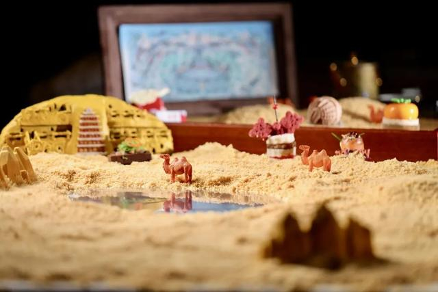 《敦煌如是绘》艺术展期间,酒店推出《故宫以东x敦煌画院》联名下午茶,在二尺茶盘的微缩沙漠之中,精心打造了以飞天乐舞、黄沙坡落日下的驼队为灵感的微景观敦煌联名主题下午茶,让我们在沙漠的怀抱里,品味敦煌沙漠的无限魅力。