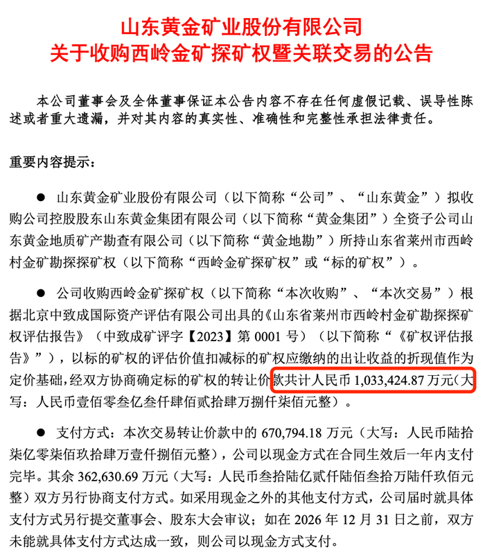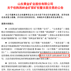 1月26日晚,山东黄金公告称,拟收购公司控股股东山东黄金集团有限公司(简称“山东黄金集团”)全资子公司山东黄金地质矿产勘查有限公司(简称“黄金地勘”)所持山东省莱州市西岭村金矿勘探探矿权(简称“西岭金矿探矿权”),转让价款共计103.34亿元。本次交易构成关联交易,但未构成重大资产重组。