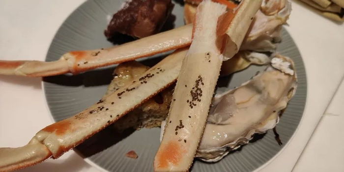 “想着这家是‘五星级’酒店,一份海鲜自助餐要几百元,出品一定不错。”当天的自助餐品种不算少,在餐台上选了几种海鲜后,程女士和朋友就开启了边吃边聊模式。突然一位朋友惊讶地发现,盘中的蟹腿上,密密麻麻附着着许多黑色的圆形颗粒。
