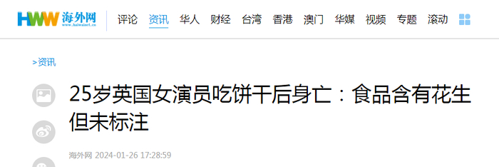 据海外网援引美联社1月26日报道,11日,在美国纽约,25岁的英国籍专业舞蹈演员奥尔拉·巴森代尔食用饼干后,因花生重度过敏身亡。据悉,相关饼干未标注含有花生成分。