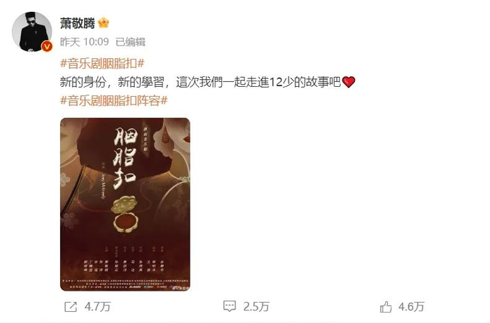 音乐剧《胭脂扣》立项的消息传出,主演部分也引发了多方关注。最终,“十二少”陈振邦这一角色选定了歌手萧敬腾。