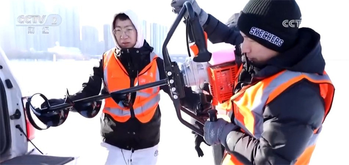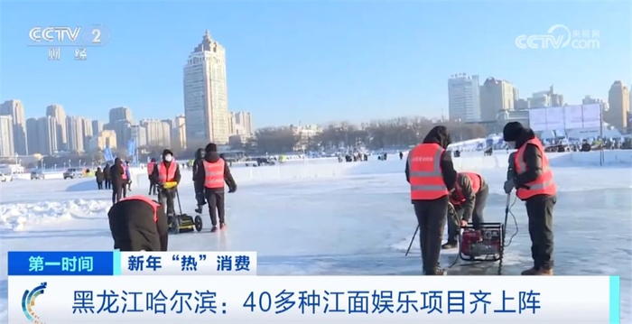 下午两点,结了冰的松花江面一片欢声笑语。冰雪气垫船、疯狂八爪鱼、雪地迷宫互动娱乐体验项目,让各地游客玩得兴致盎然。而在冰面另一侧,一群身穿橙色马甲、聚精会神工作的人们引起了记者的注意。