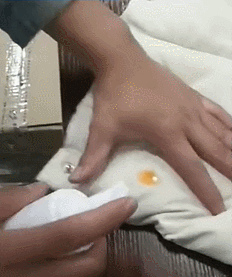 把辣椒油滴在羽绒服一角,这种油渍吸收之后是很难洗干净的。