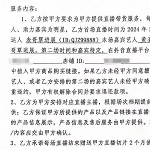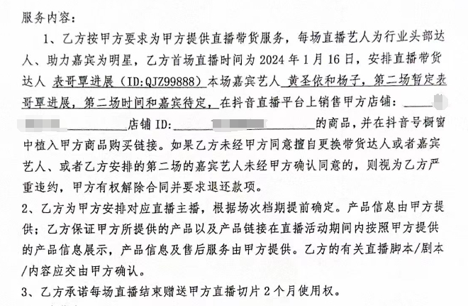 王女士提供的合同显示,晟宸泽传媒提供直播带货服务,每场直播艺人为行业头部达人,助力嘉宾为明星。其中,第一场直播时间为1月16日,由达人@表哥(覃进展)、艺人黄圣依和杨子直播;第二场的时间及艺人嘉宾待定。