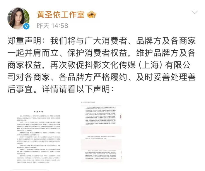 “对于任何未经授权使用黄圣依、杨子肖像或名义进行任何形式的商业活动,我方将坚决追究其法律责任。”工作室表示,他们已第一时间敦促抖影传媒对各商家、各品牌方严格履约,及时妥善处理善后事宜。