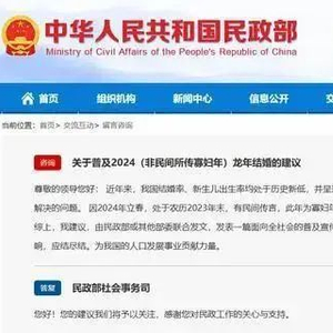 春节将至,民间传言“龙年无春,是寡妇年,不宜结婚”等说法,引起网友关注热议。针对此类传闻,近日有网友坐不住了,在民政部官网留言,建议民政部或其他部委联合发文,引导居民不受迷信、传言影响,龙年正常结婚。民政部社会事务司回应,对此将予以关注。