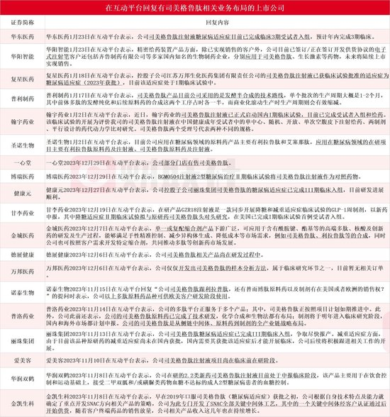 据财联社不完全梳理,今年以来包括华东医药、华阳智能、复星医药、普利制药、翰宇药业和圣诺生物在内的6家上市公司在互动平台回复有司美格鲁肽相关业务布局。此外,包括一心堂、博瑞医药、健康元、甘李药业、金城医药、德展健康、万邦医药、诺泰生物、普洛药业、丽珠集团、爱美客、华润双鹤和金凯生科在内的13家上市公司此前在互动平台回复相关业务情况,具体情况见下图: