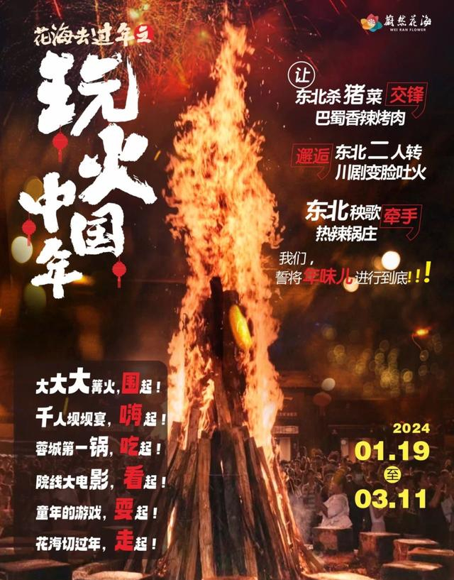 即日至3月11日,来蔚然花海,将年味进行到底!“玩火中国年”,大大大篝火,围起;千人坝坝宴,嗨起;蓉城第一锅,吃起;院线大电影,看起;童年的游戏,耍起;花海切过年,走起!团年派对188元/位,红红火火热热闹闹过新年!“寻味中国年”,Eu-RLs级别食材,吃花式“猪龙羊”,赏大师墨宝,品花艺茶道,私享派对288元/位,组年味高端局。