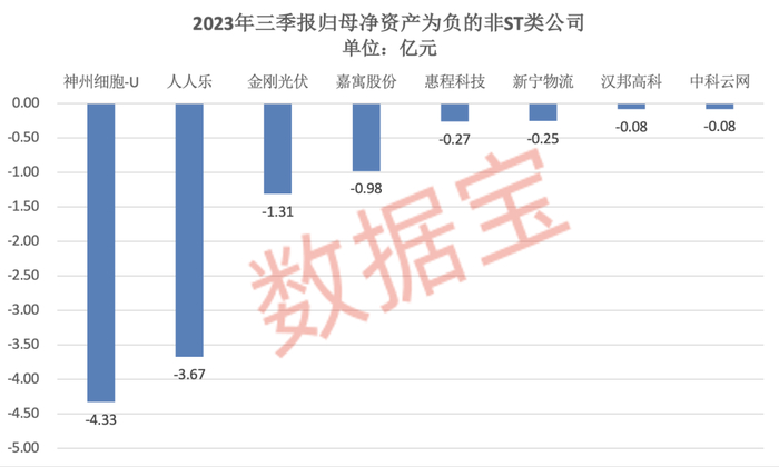 根据被*ST的条件——净资产为负,数据宝梳理,2023年三季报净资产为负的非ST公司有8家,其中神州细胞-U由于按照科创板第五套标准上市,其规则显示,以该标准上市的公司从第4个完整会计年度开始执行ST标准。2024年为该公司上市后第4个完整的会计年度,所以暂时没有*ST风险,但如果2024年公司经审计的净资产仍为负数,则可能被*ST。