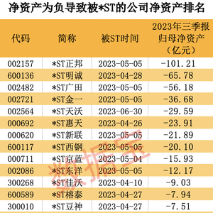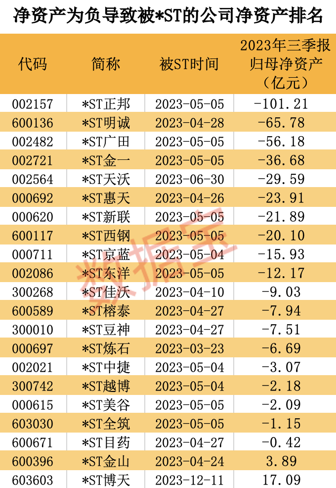 其中有21家公司因期末净资产为负值,导致被*ST(多家公司还叠加了年报被出具“无法表示意见或否定意见”的审计报告)。根据退市条件,如果2023年经审计的年报仍触及退市风险警示条件,将直接被退市。