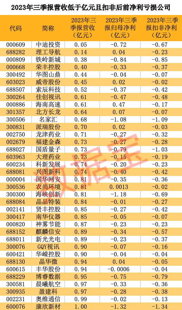 根据被*ST的条件——营业收入低于1亿元且扣非前后净利润为负,数据宝梳理显示,剔除科创板第五套标准上市的公司,2023年前三季度符合上述条件的共有36家非ST公司。其中,有6家公司2023年前三季度营收低于5000万元,包括中迪投资、理工导航、铁岭新城、荣丰控股、华图山鼎、威帝股份。