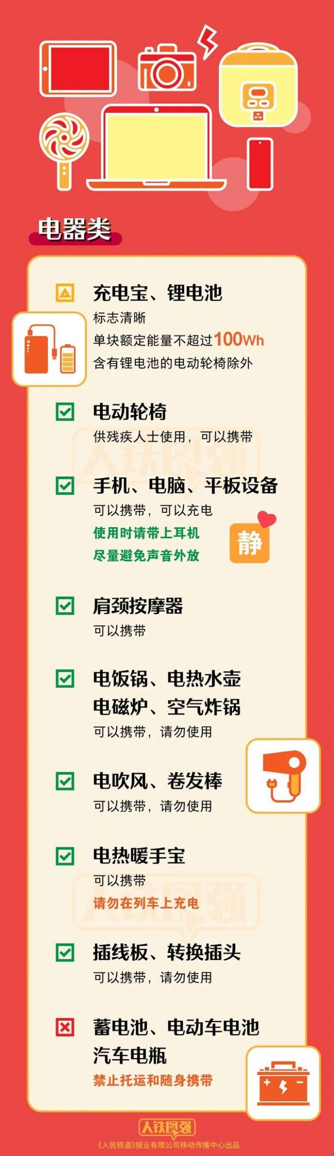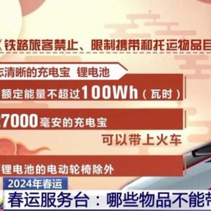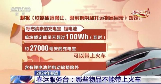 标志清晰的充电宝、锂电池,单块额定能量不超过100Wh(瓦时),约27000毫安的充电宝可以带上火车,含有锂电池的电动轮椅除外。