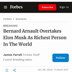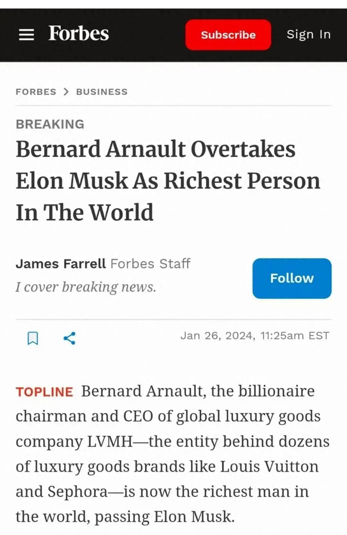 1月28日,据福布斯排行榜,奢侈品牌界一哥LVMH董事长兼CEO阿尔诺再次超过特斯拉CEO埃隆·马斯克,成为全球首富。