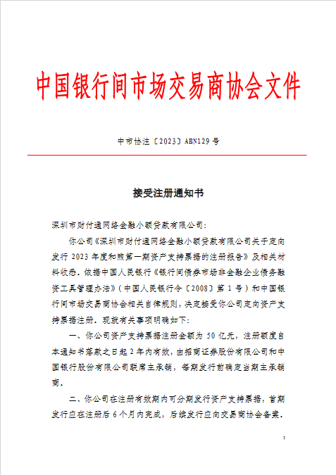 早在2017年11月,就有小贷公司获得首批ABN发行资格,但却不见发行落地。本次,财付通小贷落地首笔ABN,且发行时间距公司获得注册资格尚不足一个月。2023年12月27日,中国银行间市场交易商协会接受财付通小贷、美团小贷的定向资产支持票据注册。财付通小贷和美团小贷的资产支持票据注册金额均为 50 亿元,注册额度自通知书落款之日起2年内有效。公司在注册有效期内可分期发行资产支持票据。