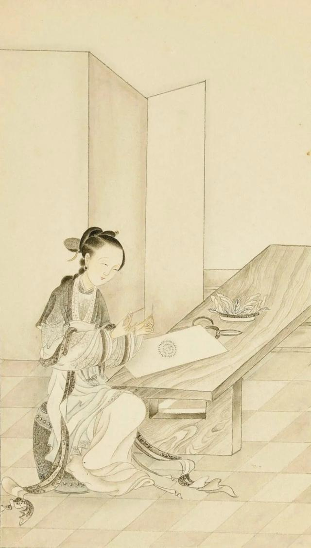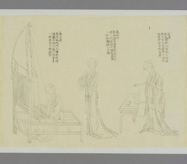 《佳妇人例图》中的苏若兰织锦图。《佳妇人例图》为《千秋绝艳图》的一个白描粉本,可供不同的画家参考临摹生产复制画作。