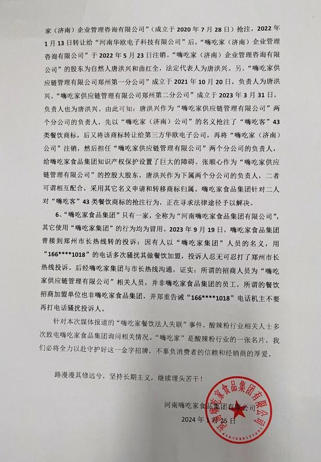 1月24日及1月25日,“河南嗨吃家食品集团有限公司”连续两天发布声明,称“嗨吃家”餐饮法人失联事件,严重损害了“嗨吃家”品牌的美誉度,并称事件中的“嗨吃家供应链管理有限公司”、“河南嗨吃家贸易有限公司”均非“河南嗨吃家食品集团有限公司”子公司,二者之间没有任何关联。