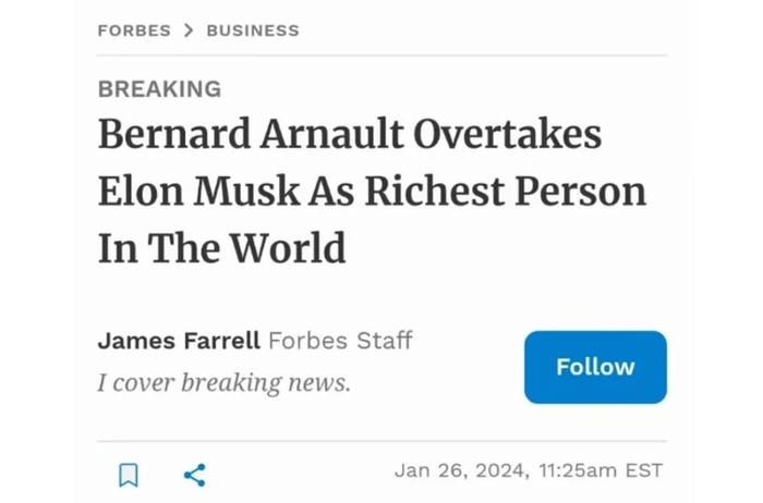 1月28日,据福布斯排行榜,奢侈品牌界一哥路威酩轩集团(LVMH)董事长兼CEO阿尔诺再次超过特斯拉CEO埃隆·马斯克,成为全球首富。根据福布斯实时亿万富翁排行榜,阿尔诺及其家族净资产为2076亿美元(约合人民币1.49万亿元),位列福布斯全球富豪榜榜首,马斯克以2047亿美元净资产紧随其后,杰夫·贝索斯则排名第三。
