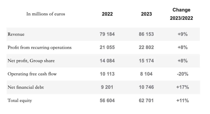 财报中,LVMH表示,尽管地缘政治和宏观经济环境仍存在不确定性,但LVMH对其在2024年继续增长的能力充满信心,对其产品为客户提供的高度独特的品质和创造力以及其管理层的专业精神充满信心,认为自己能够脱颖而出,获得市场份额。