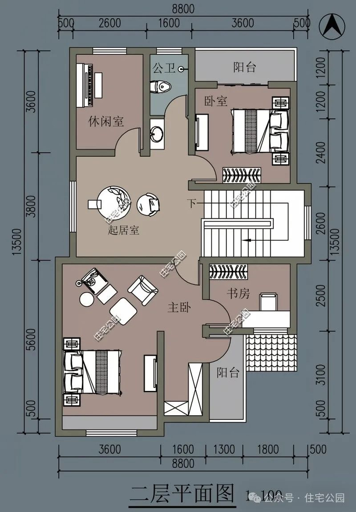 二层南向设计一个宽敞的主卧,书房、衣帽区、阳台一应俱全,提升居住品质。