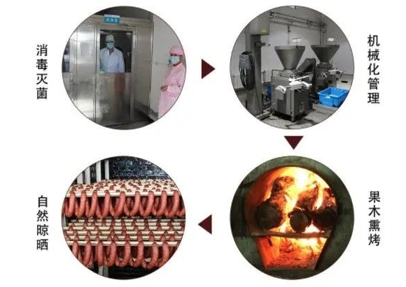 果木碳烤,老炉熏制。经过25道工序2次熏制,肉鲜味香,保证每一根红肠的品质风味。