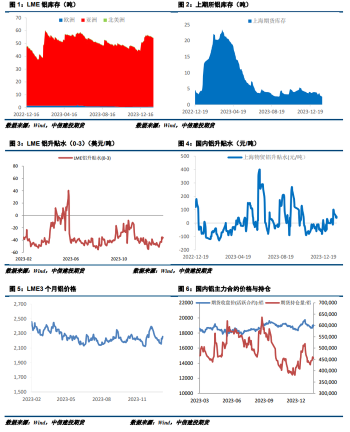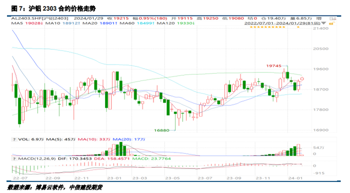 小结:宏观面美国经济韧性仍存,市场3月降息预期继续回落。国内上周央行宣布降准,同时金融监管局就支持房地产释放积极信号,宏观明显改善。基本面看,氧化铝供应仍然偏紧,下游消费稳定,山东地区氧化铝现货持续走高,预计节前氧化铝价格仍处高位。电解铝供应端现货略微偏紧,华南地区高升水维持,目前仓单数量偏低,02合约持仓较高,考虑到节后即面临交割,盘面对多头有利。消费端下游多数企业将进入春节假期,预计库存拐点将近,压制铝价反弹空间。