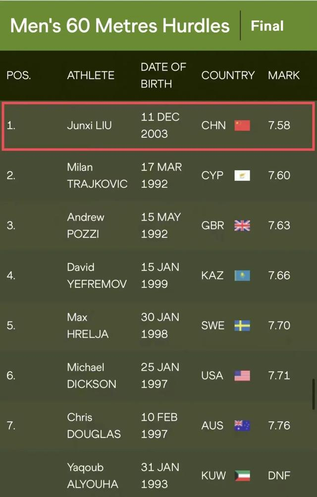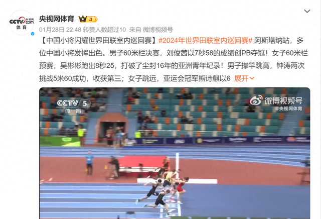 近日,在2024年世界田联室内巡回赛阿斯塔纳站男子60米栏决赛中,首次亮相世界室内巡回赛的中国小将刘俊茜以7秒58的成绩获得冠军,并创造个人最好成绩!