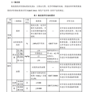 据国家邮政局2020年发布的《快递包装绿色产品评价技术要求》显示,集装袋主要由天然、化学纤维编织而成,其他纺织纤维类集装袋的评价指标要求应符合GB/T 35611 绿色产品评价纺织产品的规定。在集装袋的重金属检测方面,需要满足铅(Pb)≤10mg/kg;汞(Hg)不得检出;镉(Cd)≤5mg/kg;铬(Cr)≤50mg/kg,而评价办法是对申请企业提供的检测报告进行审查或抽样检测。