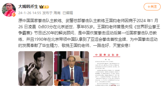 @ALA萌萌哒:我爷爷是拳击迷,从小几乎每周都和爷爷一起看拳赛,听王老师的解说。王老师还比我爷爷小两岁……爷爷听到这个消息应该也会像失去老朋友一样伤感吧