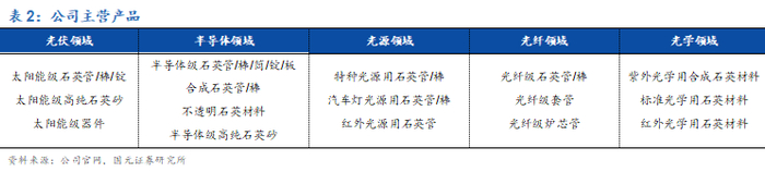公司主要使用天然石英矿石材料从事高纯石英砂、高纯石英管(棒、板、锭、筒)、石英坩埚及其他石英材料的研发、生产与销售,产品主要应用于光源、光伏、半导体、光纤、光学等领域。公司是业界少数具备生产高纯石英砂和半导体、光伏、光电用石英玻璃材料及其精密加工制品的全产业链企业,在国内外石英行业中均具有强大的影响力和竞争优势。