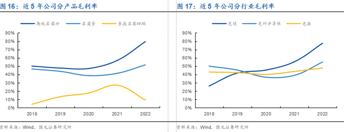毛利方面,2018~2022年高纯石英砂毛利占比由7.74%上升至70.43%,石英管毛利占比由90.54%降至28.94%,一方面由于光伏和半导体下游需求旺盛,驱动高纯石英砂业绩爆发式增长,另一方面高纯石英砂毛利率近五年始终维持高位,2022年毛利率为79.46%。
