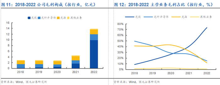 毛利方面,2018~2022年光源、光纤半导体和光伏复合增速分别为8.30%、10.36%、155.97%,2022年毛利占比分别为11.42%、14.83%、73.16%。