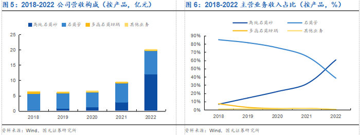 按照产品口径划分,石英管和高纯石英砂是公司主要收入来源,近4年两项营收合计占比均超过95%。其中,石英管营收由2018年的5.39亿元增至2022年的7.70亿元,期间复合增速高达9.34%,高纯石英砂营收由2018年的0.43亿元增至2022年的12.15亿元,期间复合增速为130.73%,截至2022年底,高纯石英砂收入占比达到60.60%,石英管占比38.44%。
