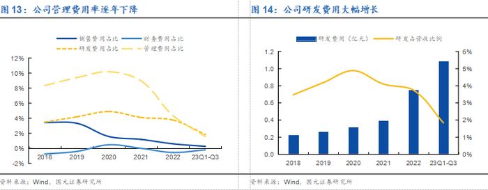 公司期间费用率总体呈下降趋势。具体来看,销售费用率近5年连续下降,2022年为0.59%,管理费用率2020年以来下降显著,由10.18%持续降至2022年的4.33%,体现了公司较强的费用管控能力。研发投入在2018-2021年保持稳定增长,2022年在保持高收入的同时进一步加大了研发投入,研发费用达到0.75亿元,同比增长90.63%,研发费用率为3.75%;2023前三季度研发费用1.08亿元,同比增长159.64%,研发费用大幅增长,为公司长期发展注入动力。