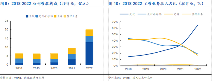按照下游行业口径划分,公司营收主要分布在光伏、光源和光纤半导体领域。2018-2022年,光源和光纤半导体营收整体呈增长态势,期间复合增速分别为5.44%和7.83%;受下游需求驱动,光伏营收增长迅速,由2018年的0.89亿元增至2022年的12.93亿元,期间复合增速高达95.14%,2022年营收占比64.54%。