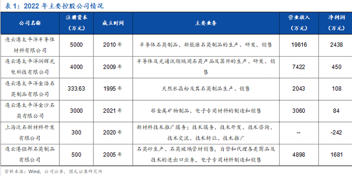 公司目前全资子公司有5家,包括太平洋半导体、润辉光电、金浩石英、太平洋金沙、上海泛石,2022年净利润分别为2437.64万元、450.10万元、108.11万元、84.19万元、-242.29万元。其中,太平洋半导体主营产品为半导体石英制品和新能源石英制品,润辉光电主营产品为半导体及光通讯领域用石英产品及器件,金浩石英主营天然水晶粉及其石英制品。