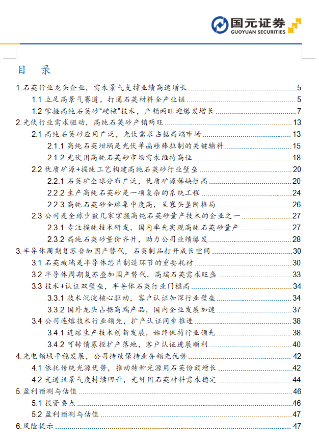 本报告摘自国元证券2024年1月27日已发布的《国元证券公司研究-石英股份(603688)首次覆盖报告:石英技术行业领先,下游放量成长加速》查看原文,具体报告及分析内容请详见报告。若因对报告的摘编等产生歧义,应以报告发布当日的完整内容为准。