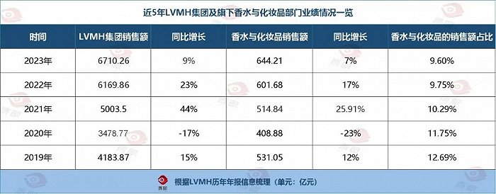 昨日晚间(1月25日),LVMH集团(路威酩轩)发布的2023年全年财报显示,该集团销售额为6710.26亿元,同比增长9%,有机增长为13%。其中,香水与化妆品部门在2023年的销售额则首次突破80亿欧元,同比增长7%,有机增长为11%,创下近5年新高。