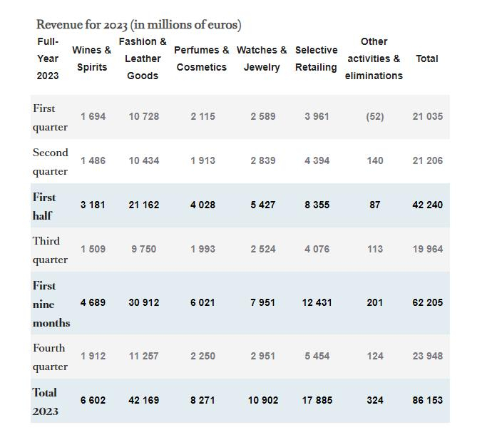 整体来看,LVMH的全球市场份额再次扩大,其在欧洲、日本和亚洲其他地区均实现了两位数的有机收入增长。从LVMH旗下的6大业务板块来看,除葡萄酒和烈酒部门录得7%的同比下滑外,其余5大业务部门的销售额均实现了增长。其中,尤以精选零售部门的增幅最高,为20%,有机增长为25%;该部门的经常性业务利润更是增长了76%。