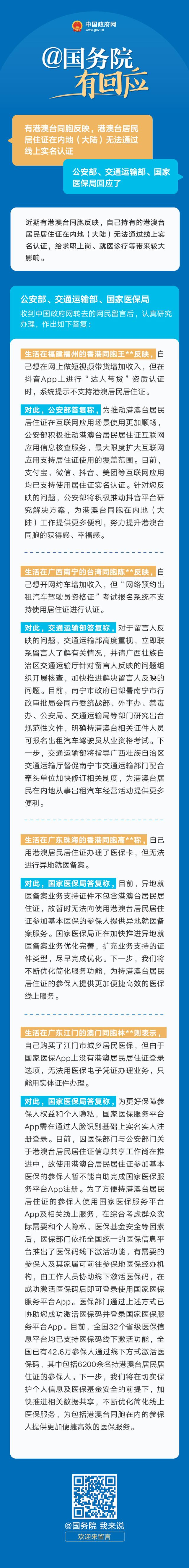 公安部、交通运输部、国家医保局答网民关于“加快推进港澳台居民居住证线上实名认证”的留言