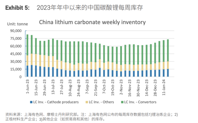从中游锂生产来看,根据上海有色网的数据,截至2024年1月底的传统淡季,中国的碳 酸锂库存逐渐增加至7.3万吨。