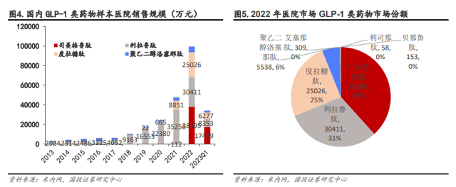近年来国内市场上GLP-1多肽类药物销售规模迅速扩张,预计2022年整体销售额达60亿元(样本医院销售额约10亿元,预计放大6倍,注:根据诺和诺德财报2022年司美格鲁肽中国销售额约22亿元,约样本医院销售额5.8倍)。