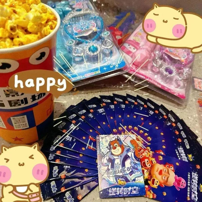 参与活动的每组家庭将获得新年礼包一份(新年礼包:爆米花1桶、熊出没盲卡1张、电影周边贴画1张、仙女棒/发光箭1只。)