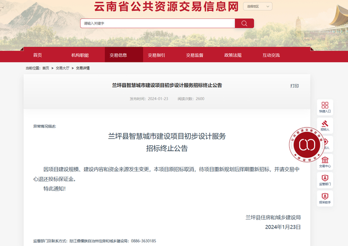 财联社梳理上述部分重点省份公共资源交易平台后发现,部分非产业类的工程项目近期被终止居多。如,云南省兰坪县智慧城市建设项目终止公告显示,“因项目建设规模、建设内容和资金来源发生变更,本项目原招标取消,待项目重新规划后择期重新招标,并请交易中心退还投标保证金”。