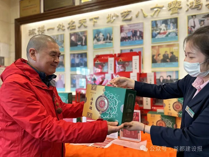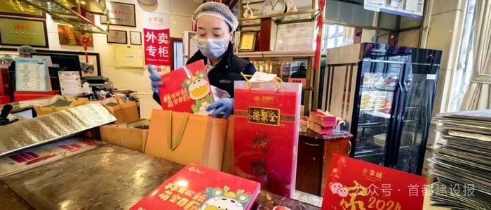 1月28日上午11时,护国寺小吃地安门店的橱窗前排起了长队,为龙年新春预备的扒鸡礼盒供不应求。门店服务经理游元元一边打包,一边介绍道:“每日凌晨3点钟开始做,焖制8小时,上午10点出锅,基本就售卖一空了。酱牛肉、牛蹄筋礼盒都有,订礼盒的人还是挺多的。”在后厨,金黄酥脆的奶油炸糕、玉白粉糯的艾窝窝、香甜的驴打滚……各式各样的老北京点心礼盒正在加紧制作。“焦圈、糖耳朵、糖火烧、麒麟酥、奶油炸糕,过年过节走亲访友非常适合,预计下周会迎来销售高峰期。”游元元说。