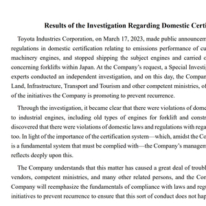 报告显示,特别调查委员会通过调查发现,TICO生产的工业发动机(包括用于叉车和工程机械的旧型号发动机)存在违反日本法律法规的行为,而且委员会发现TICO生产的部分汽车发动机也存在违规行为。报告中称,鉴于认证体系的重要性,TICO管理层对此极为重视并进行了深刻反思。