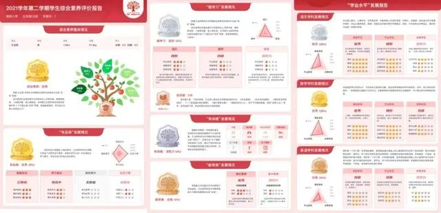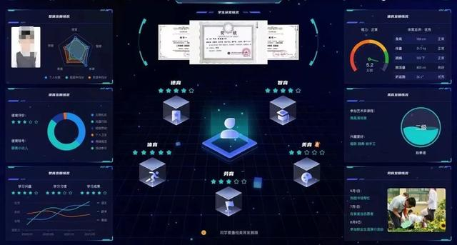 闵行区田园外国语实验小学以学生核心素养为目标,从学生五育融合出发,通过大数据+AI分析生成学生成长报告,从“明理尚德、人文阅读、梳理思维、科技创新、艺术审美、生活劳动、身心健康”七个维度对学生综合素质评价,教师在教学场景中采集学生的体质健康、日常表现、学业发展、作业练习、活动经历、个性特长、荣誉获奖等多维度发展数据,增强关键数据跟踪的科学性、可测性,从而给出学生个性化成长的发展建议。