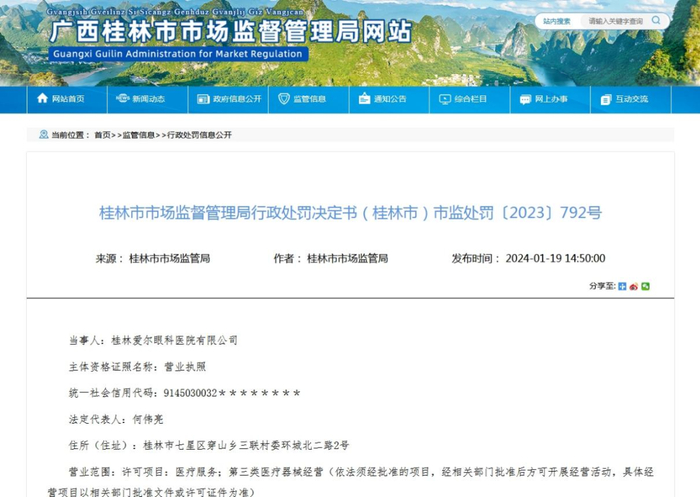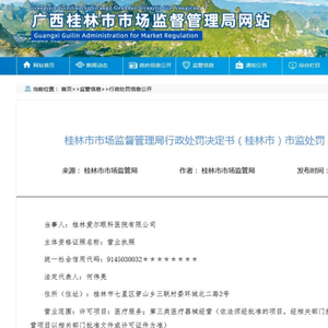 1月25日,记者从广西壮族自治区桂林市市场监管局官网获悉,因违法发布医疗广告,桂林爱尔眼科医院有限公司被市场监管部门依法处以罚款10000元。