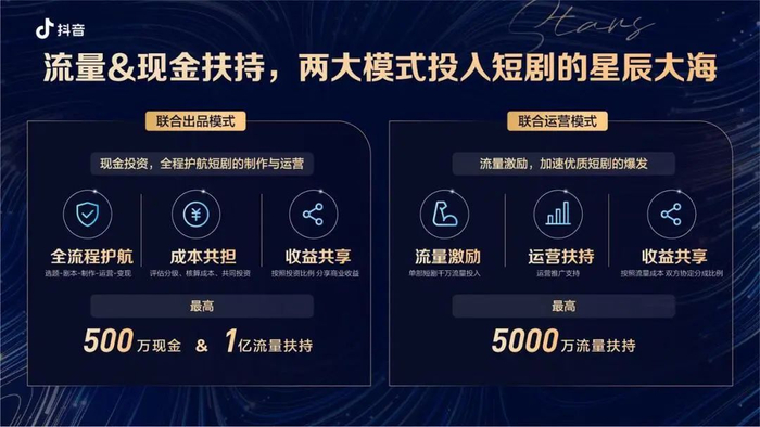 第二种联合运营模式,由创作者和机构负责微短剧开发制作,抖音提供千万级流量扶持和全方位的运营支持。