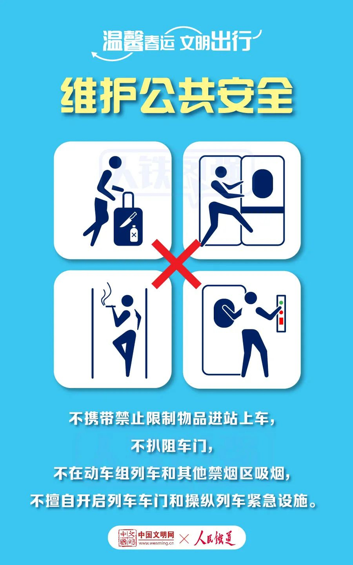 启动仪式上,中国文明网、《人民铁道》报业有限公司共同发布了《铁路旅客文明出行倡议》,从遵守站车秩序、维护公共安全、保持环境卫生、爱护设备设施、讲究以礼待人等五个方面,倡导旅客树立文明观念、争当文明使者、展示文明形象。